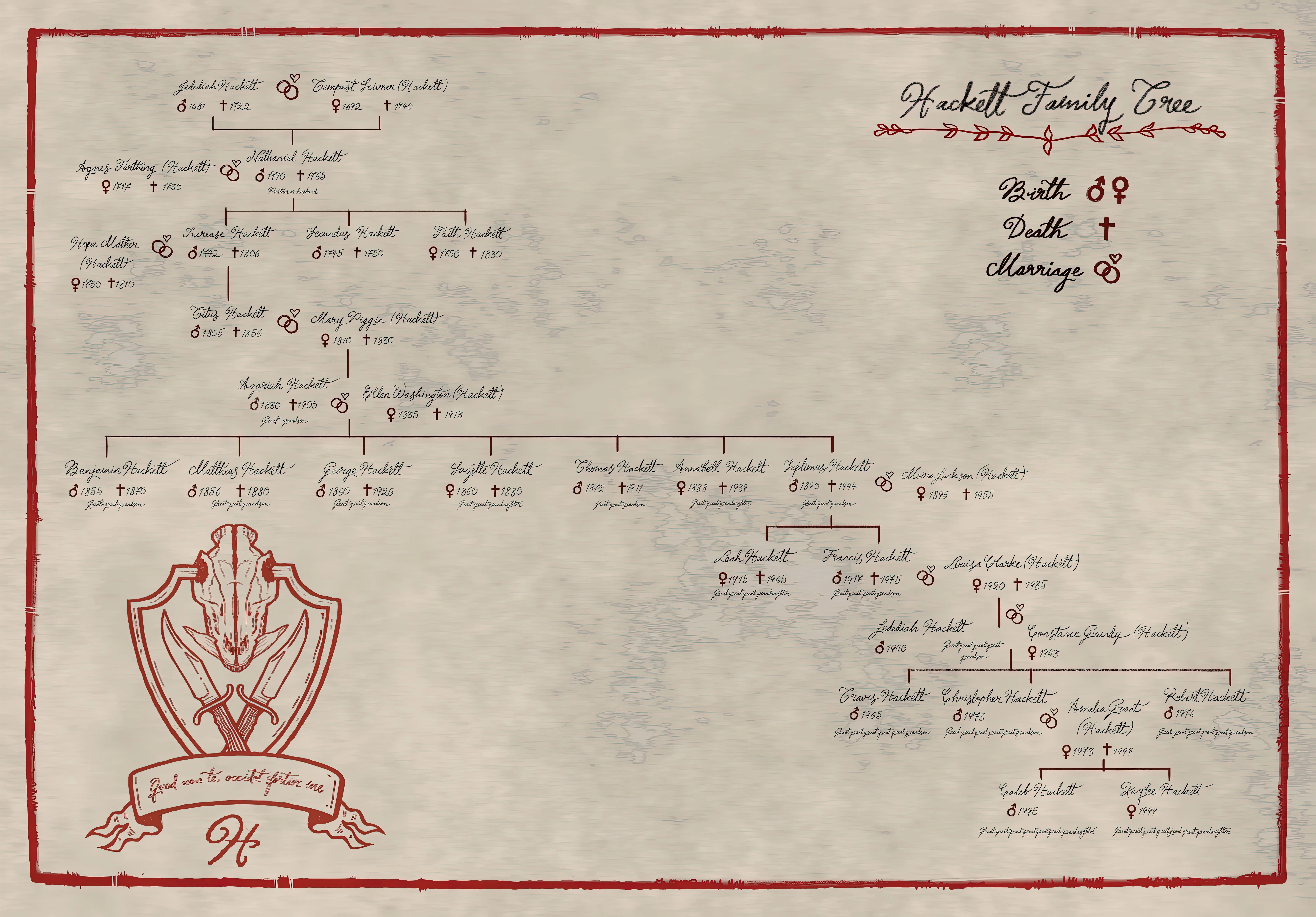 Septimus Hackett - Son of Agariah Hackett and Ellen Washington (Hackett), brother of Benjamin Hackett, Mattheus Hackett, George Hackett, Suzette Hackett, Thomas Hackett and Annabell Hackett, husband of Moira Jackson (Hackett), father of Leah Hackett and Francis Hackett